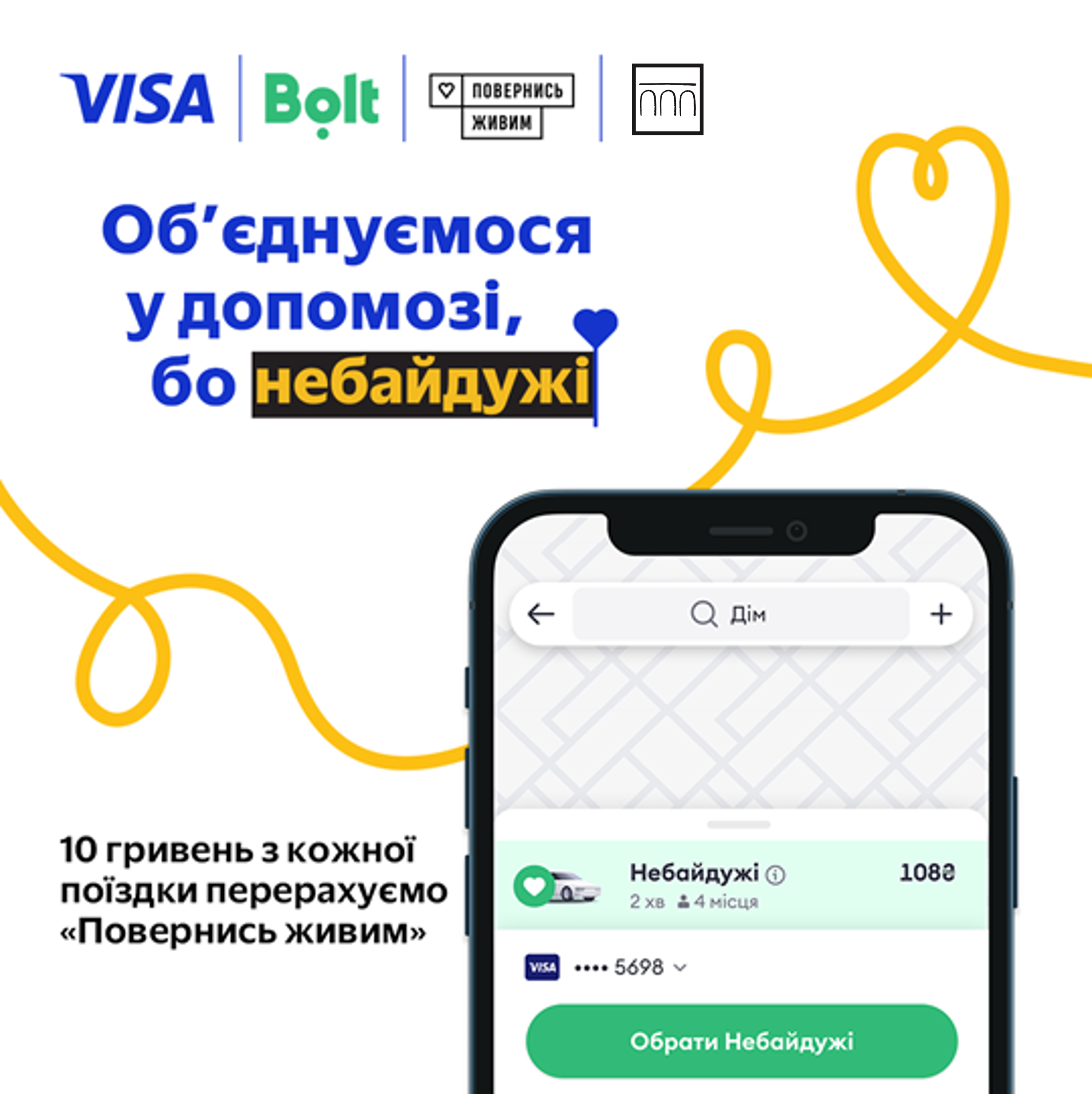 Розраховуйтеся за свої поїздки з Bolt у категорії «Небайдужі» карткою Visa, а ми автоматично перераховуватимемо за кожну з них по 10 грн у благодійний фонд «Повернись живим».