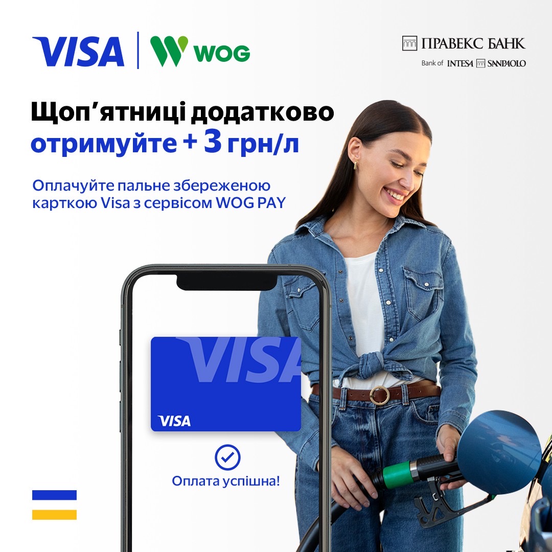 Пропозиція діє для держателів усіх карток Visa від ПРАВЕКС БАНК в мережі АЗК WOG в Україні щоп’ятниці з 05.07.24 до 16.08.24 року, або до вичерпання бюджету пропозиції, залежно від того, яка подія настане раніше.